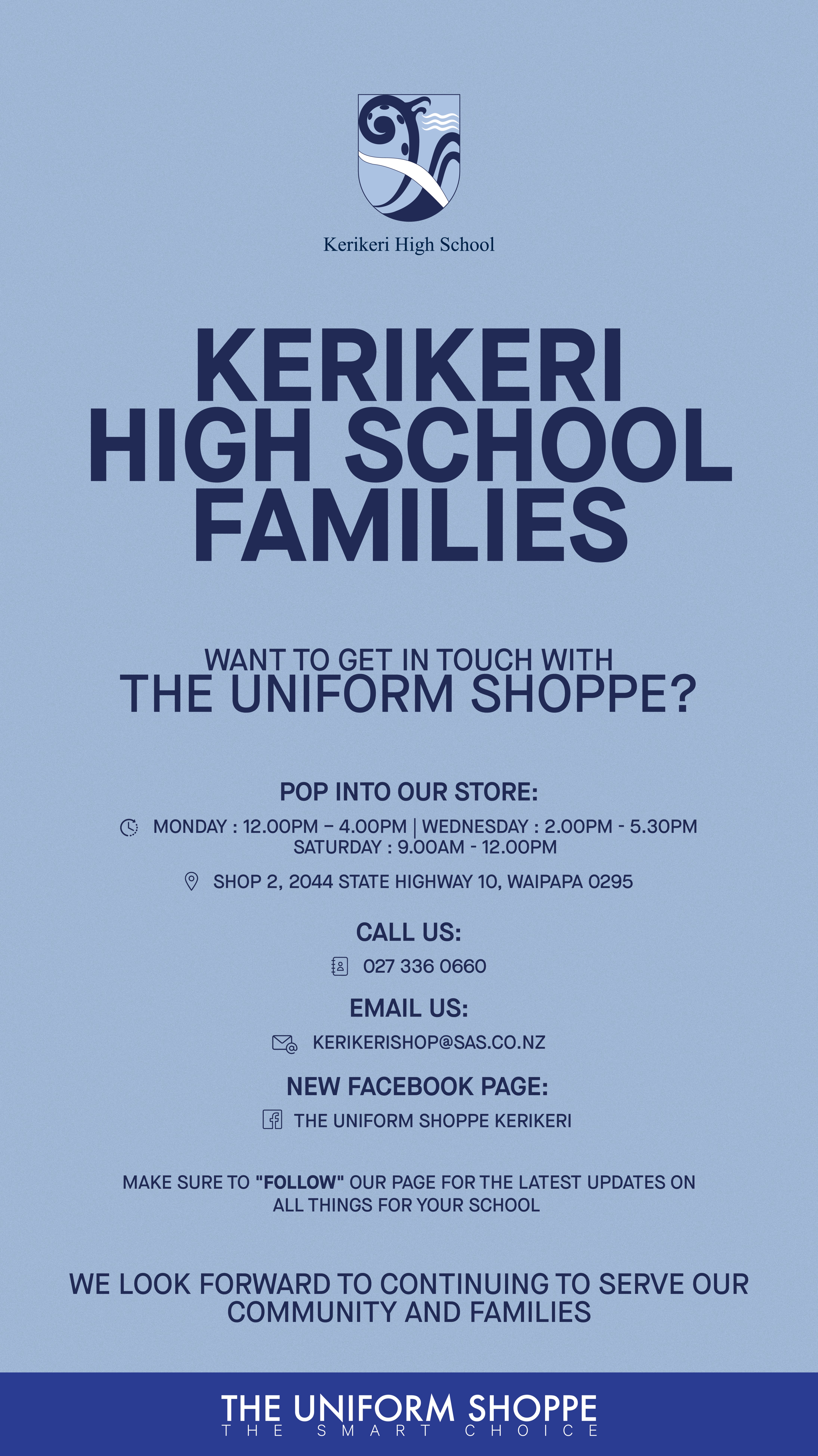 We have been advised that due to a tangi, The Uniform Shoppe will be closed on Saturday 21 February. Normal opening hours will resume after that.