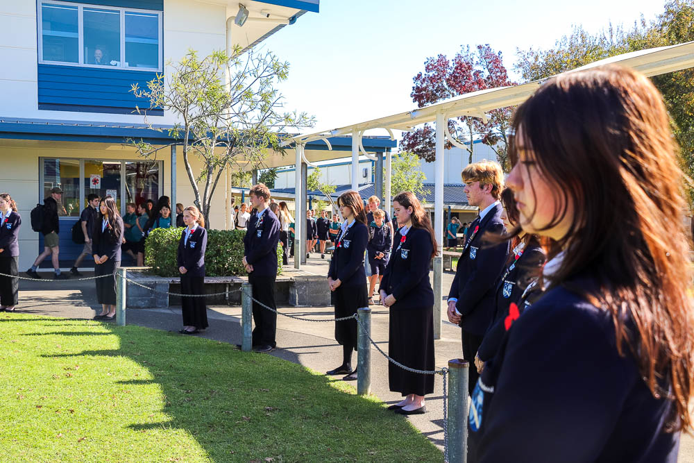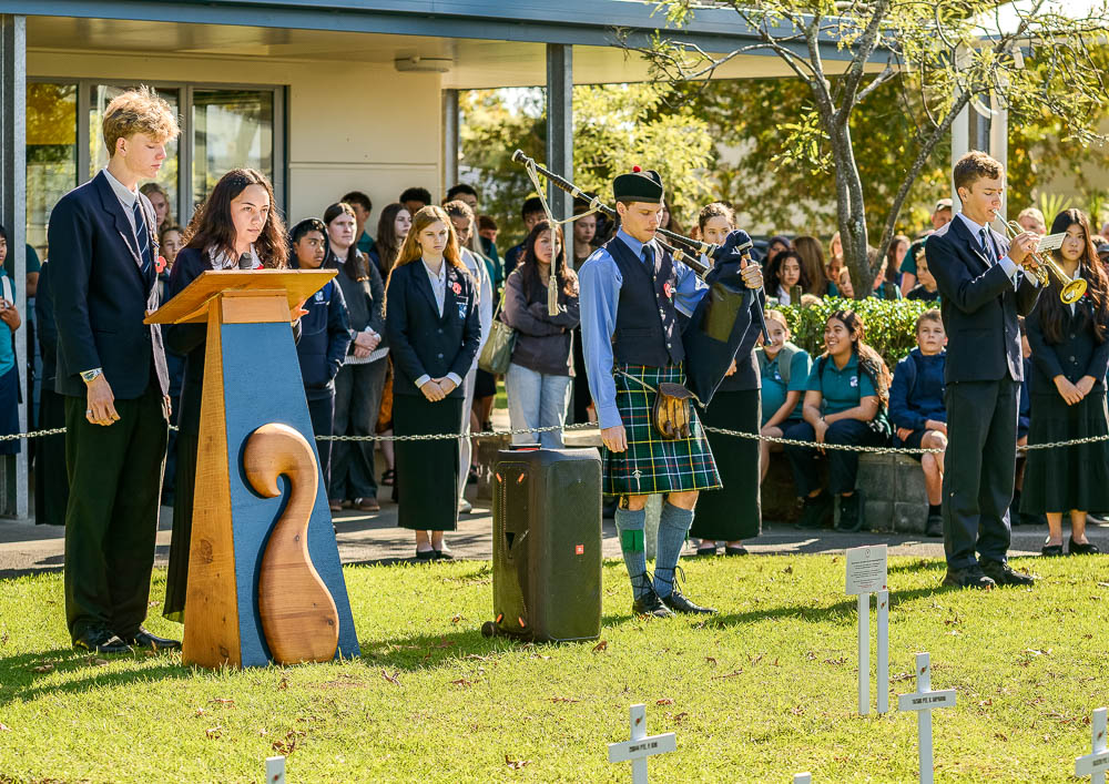 The Roll of Honour was read by Head Boy Joe Jackson, and he also shared his speech which he had presented at the Kerikeri Civic Service held on Anzac Day. The Ode of Remembrance was read in Te Reo and English by Head Girl Molly Para. The Last Post and Reveille were played by Year 10 student Maks Gvardijancic, and Hunter McInnes (Year 13) played the bagpipes.