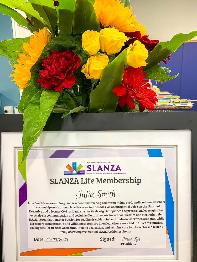 Congratulations to Mrs Julia Smith, our Library Manager, who received a Life Membership Award at the SLANZA (School Library Association of New Zealand Aotearoa) hui. This is the highest honour SLANZA bestows, and it recognises Julia as an exemplary leader both on the National Executive and within the profession. It acknowledges her passion for reading and highlights the outstanding work she does with students and colleagues.